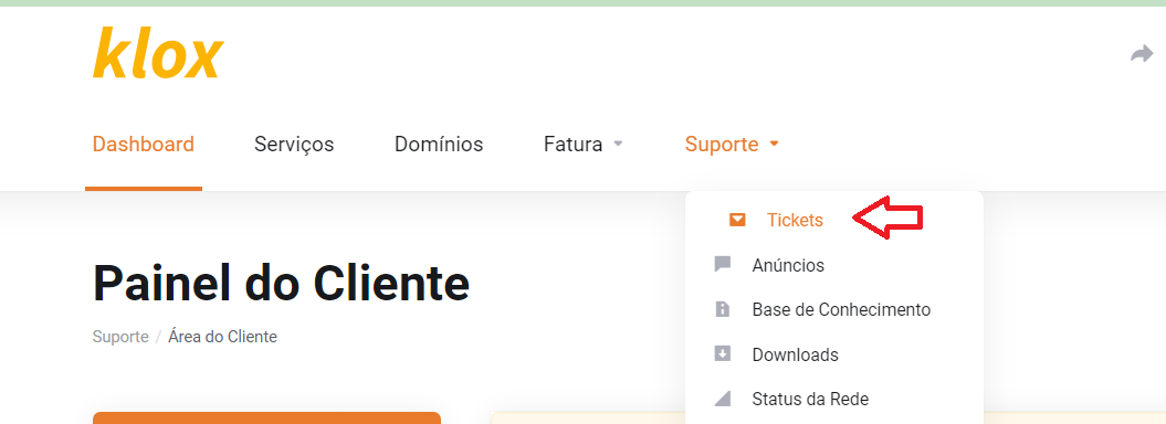 Para abrir um ticket basta acessar sua área do cliente e no menu clicar na opção Suporte >Tickets > Abrir Ticket: